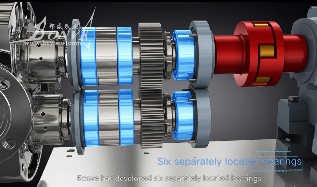 A caixa de engrenagens interna é projetada com seis estruturas de rolamentos dispostas separadamente (cada eixo tem três rolamentos), de modo que o eixo seja tensionado em três pontos em um e, em seguida, processado por equipamento de alta precisão, de modo que o rotor e o corpo da bomba não tenham coeficiente de atrito.