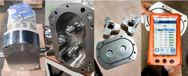 - Aço inoxidável 316/316L para peças molhadas: todas as peças que entram em contato com o fluido transferido (lóbulos, corpo da bomba, portas de entrada/saída) são feitas de aço inoxidável 316/316L.