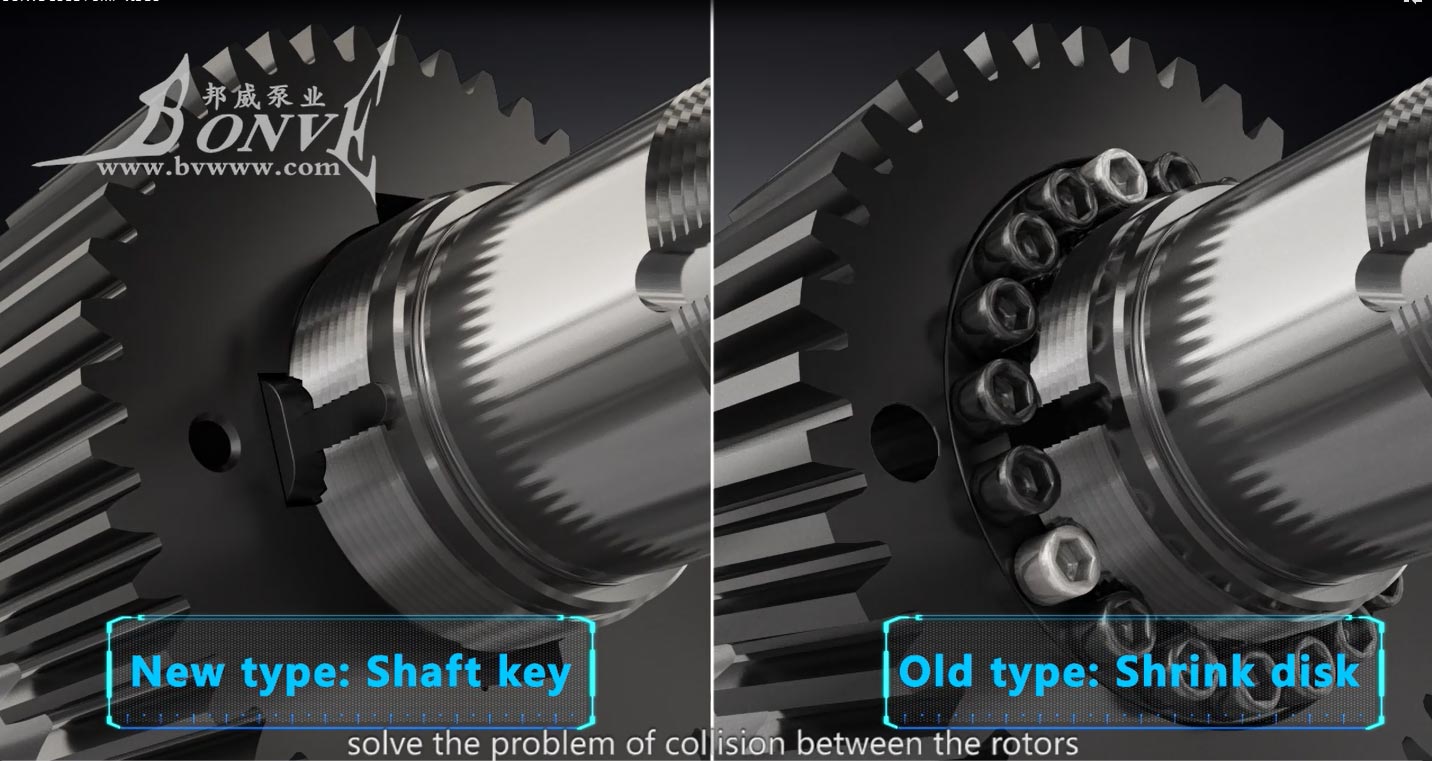 A combinação de engrenagem síncrona e eixo adota um design de estrutura chave para substituir o disco de contração, de modo a evitar o fenômeno de deslizamento da engrenagem ou colisão do rotor quando a bomba está sob alta pressão, alta viscosidade e partida instantânea.