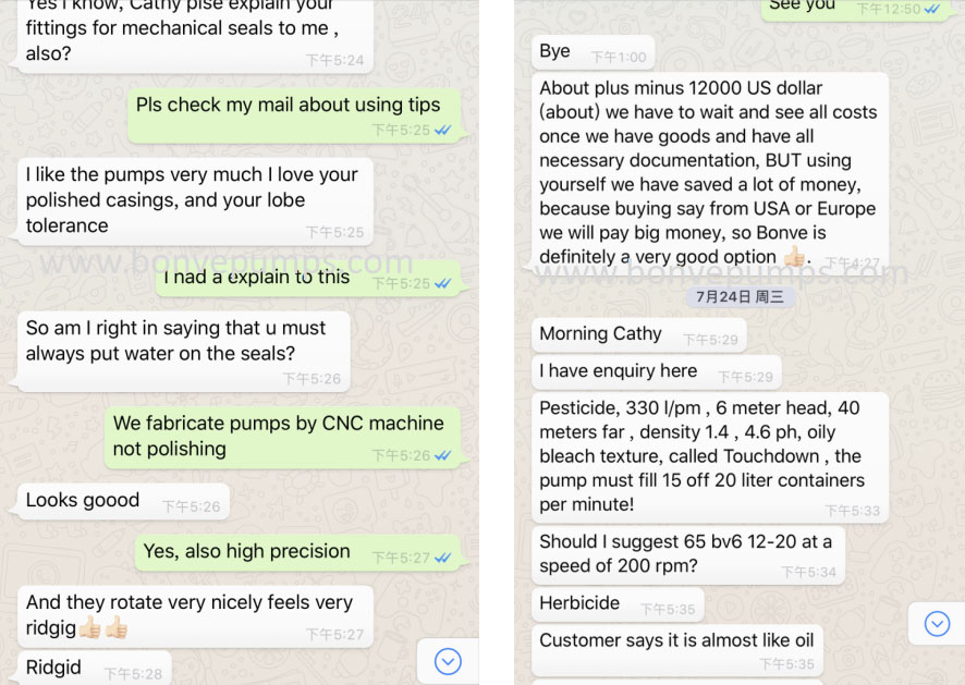 Trabalhamos com um revendedor do setor alimentício e eles estão muito satisfeitos com o acabamento liso da superfície da bomba de lóbulos Bonve e com o preço.